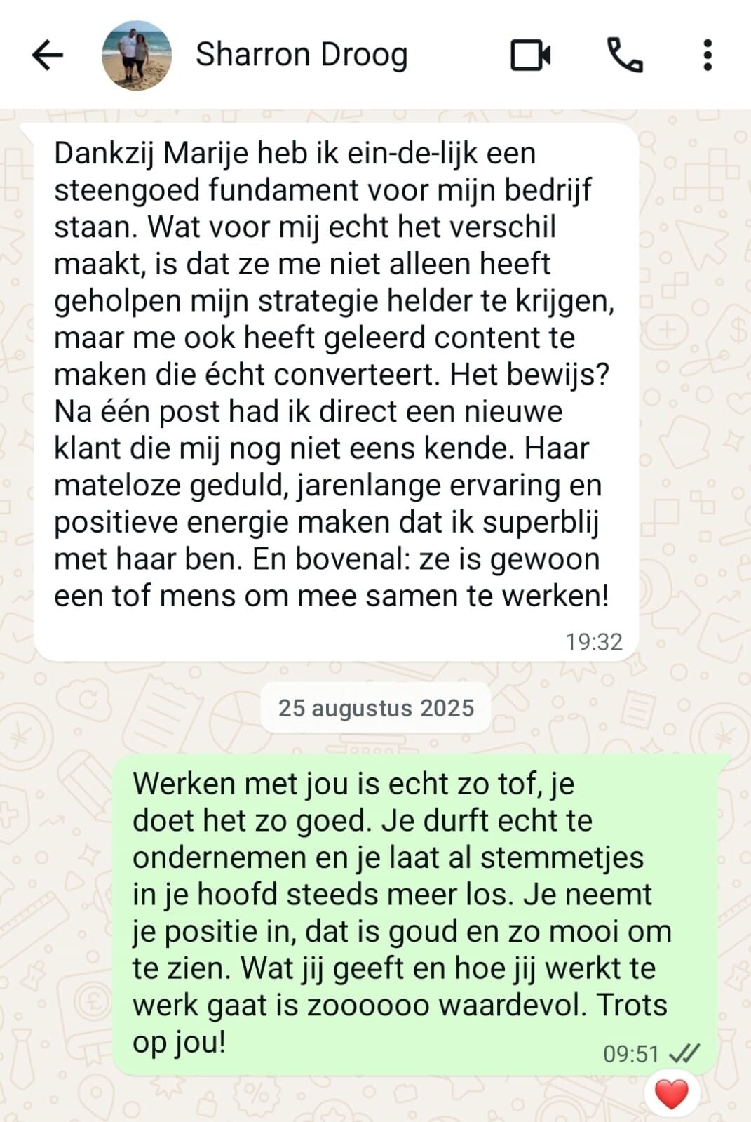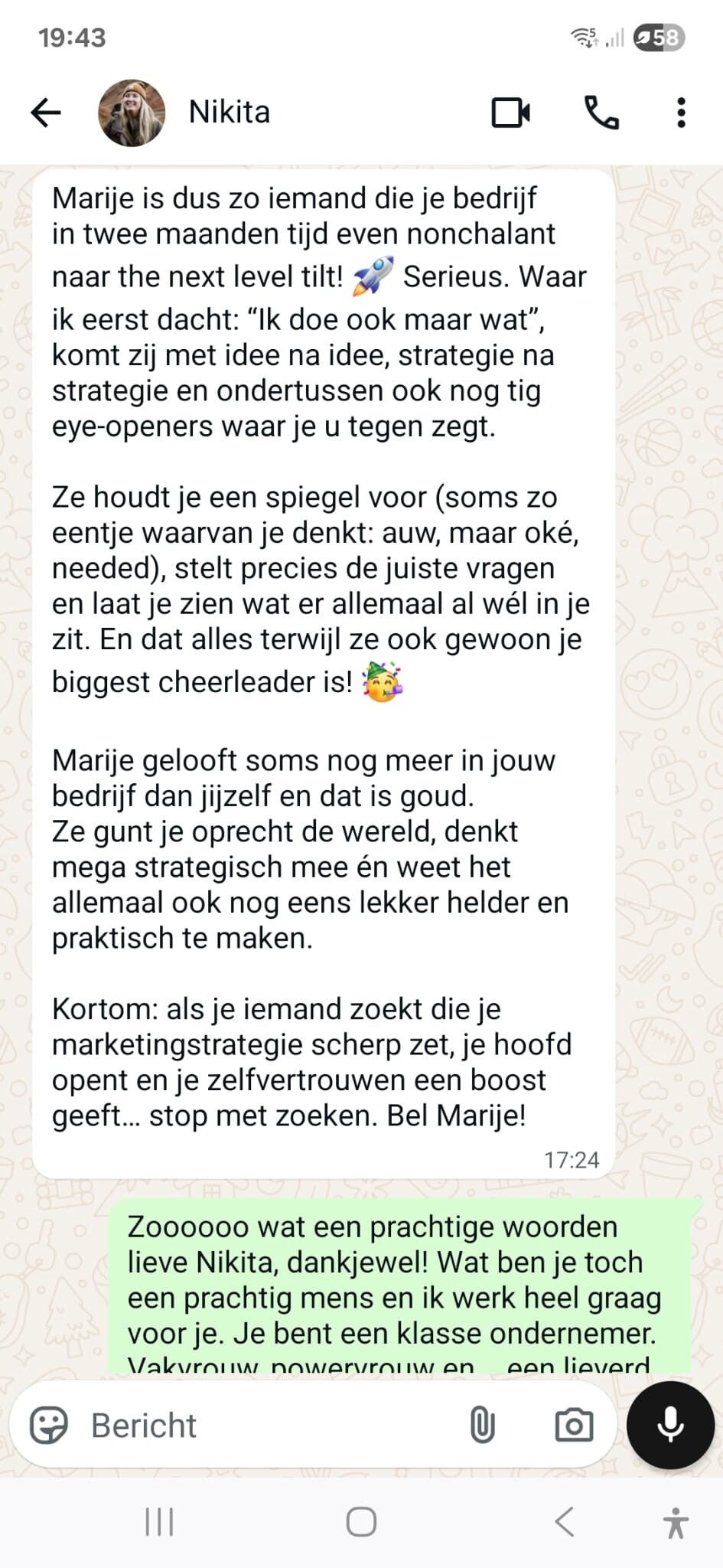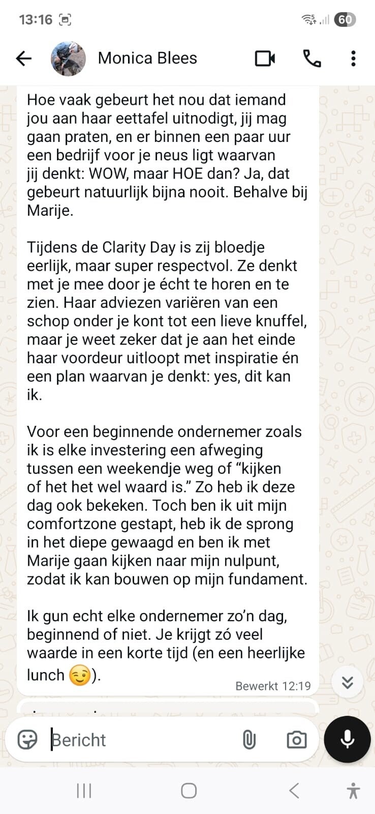 "Tijdens de Clarity Day is Marije bloedje eerlijk, maar super respectvol. Ze denkt met je mee door je écht te horen en te zien. Aan het einde van de dag loop je de voordeur uit met inspiratie én een plan waarvan je denkt: Yes, dit kan ik."